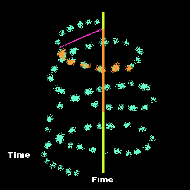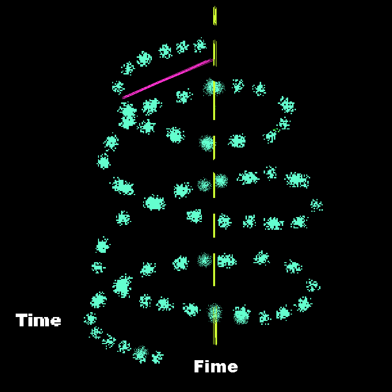 The second animation illustrates what happens when the LN-axis bipresents (presents on both the time and the fime axes). This results in the bipositioning of the LN-axis. This bipositioning can explain, among other things, how one "physical concept" can be found on two different points in time, as we may say "at the same time!", thus fulfilling the conditions of the process of "Breaking through Time".